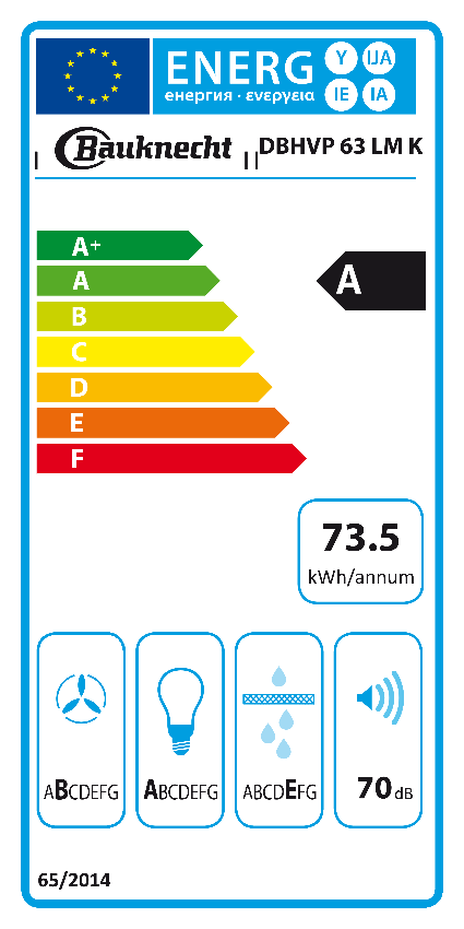 - Energieeffizienzklasse A, Beleuchtungseffizienzklasse A, Fettabscheidegradklasse E, fluiddynamische Effizienzklasse B