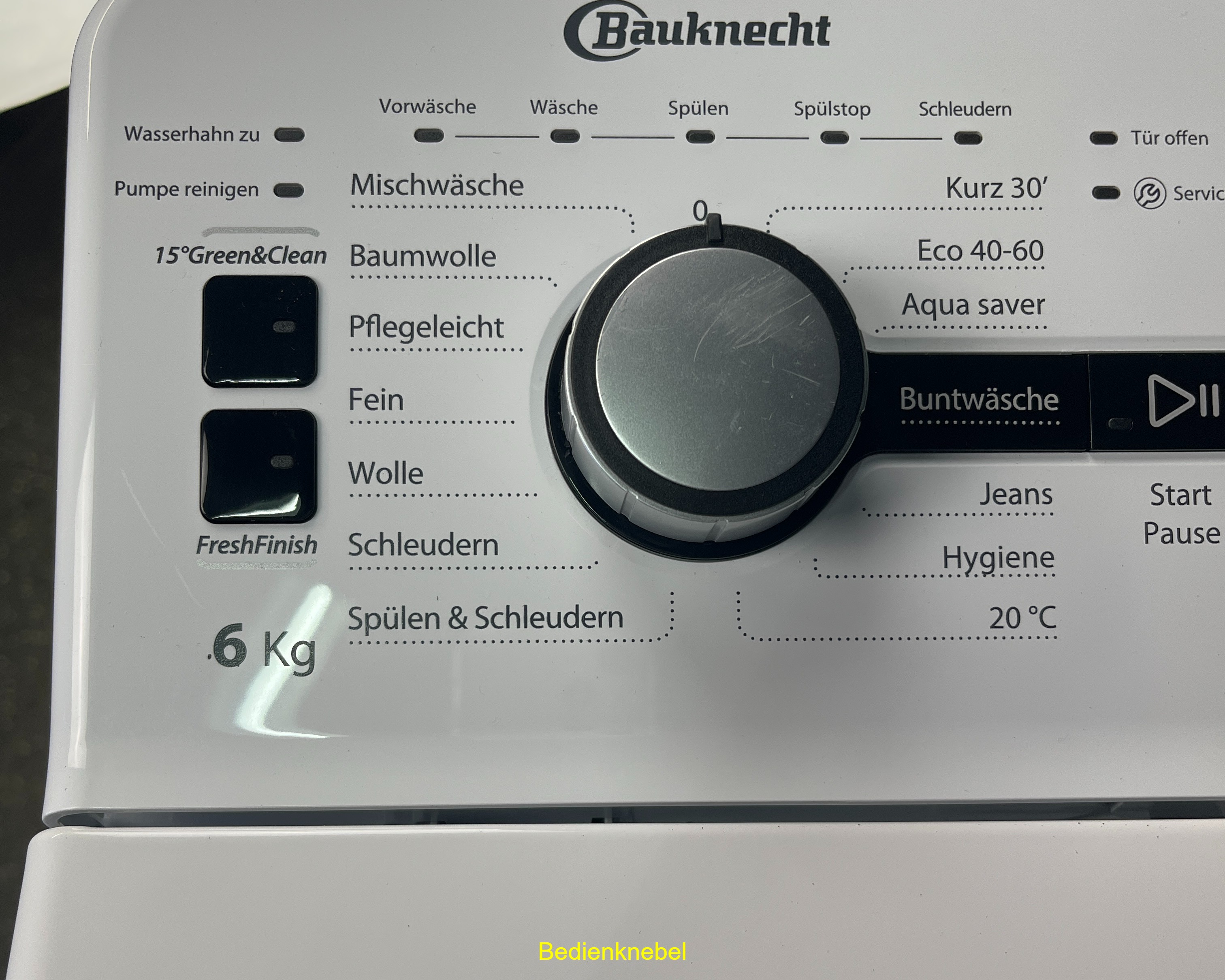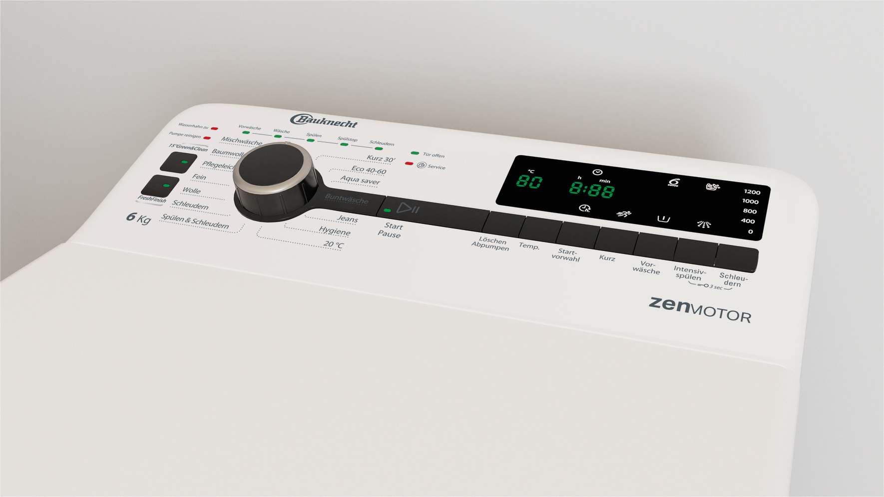 - Temperaturvorwahl, Vorwäsche, Intensivspülen, Spülen und Schleudern, Drehzahlreduzierung, ohne Endschleudern, Start/Pause, Löschen-Taste