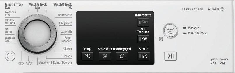 - Active Care Wash & Dry Technologie – perfekte Wasch- und Trocknungsergebnisse, auch bei großen Wäschestücken