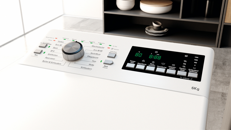 - Energieoptimierte Grundprogramme: Buntwäsche, 20 °C, Spülen + Schleudern, Mischwäsche, Eco 40-60, Pflegeleicht, Wolle, Schleudern, Feinwäsche
