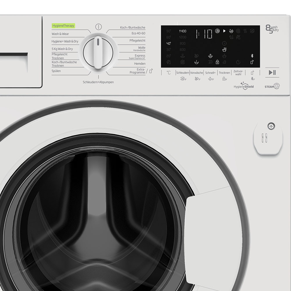 Der Einbau-Waschtrockner WDWI85141 mit SteamCure-Dampffunktion ist der perfekte Allrounder für Ihren Haushalt. SteamCure hilft, den Schmutz einzuweichen und zu lösen. Am Ende des Programms wird dank SteamCure die Faltenbildung gemildert und die Hygiene im Gerät unterstützt. Er zeigt sich äußerst sparsam im Wasser- und Energieverbrauch mit Effizienzklasse D für Waschen+Trocknen. Dank 15 individuellen Wasch- und Trockenprogrammen haben Sie für jede Situation das passende Programm zur Hand, egal ob es mal schnell gehen soll oder ein großer Wäscheberg zu bewältigen ist. Alle Programme lassen sich bequem via Bluetooth einstellen, steuern und überwachen (HomeWhiz-App erforderlich, zu finden über den App-Store oder Google Play Store). Die App bietet zudem noch 5 weitere Programmfunktionen. Dank AddXtra Nachlegefunktion macht es auch nichts, wenn mal ein Kleidungsstück vergessen wurde. Mit der Aquawave-Schontrommel garantiert der Waschtrockner einen sanften und schonenden Umgang mit Ihrer Wäsche, damit Sie lange Freude an Ihrer Kleidung haben.