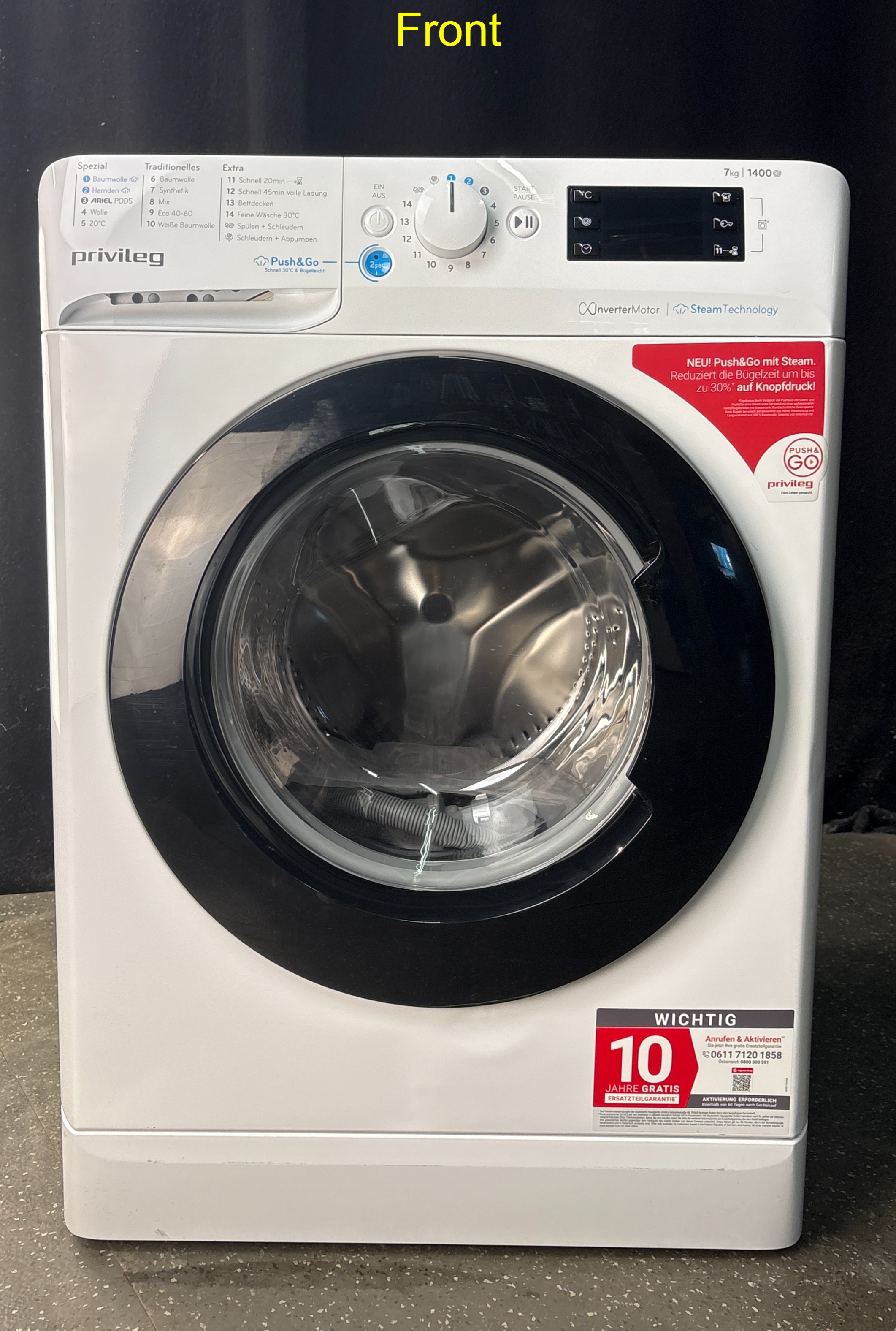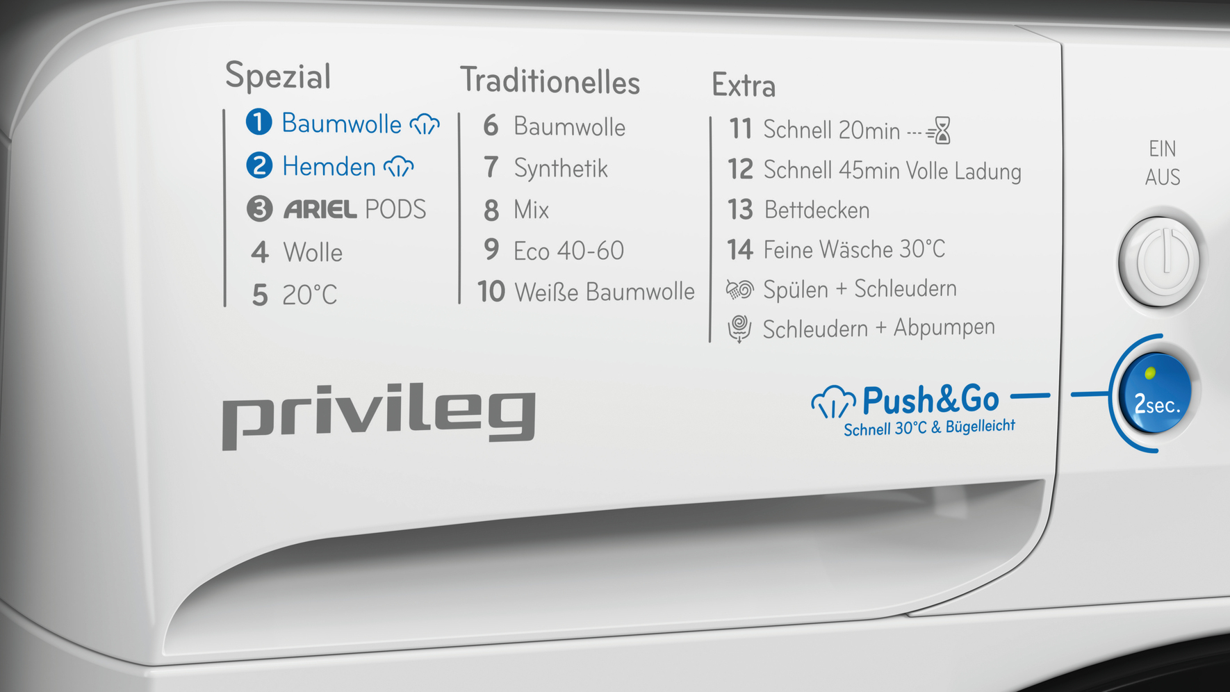 - Spezielle Programme: Daunen, Synthetik 30°, Baumwolle 30°, Ariel PODS