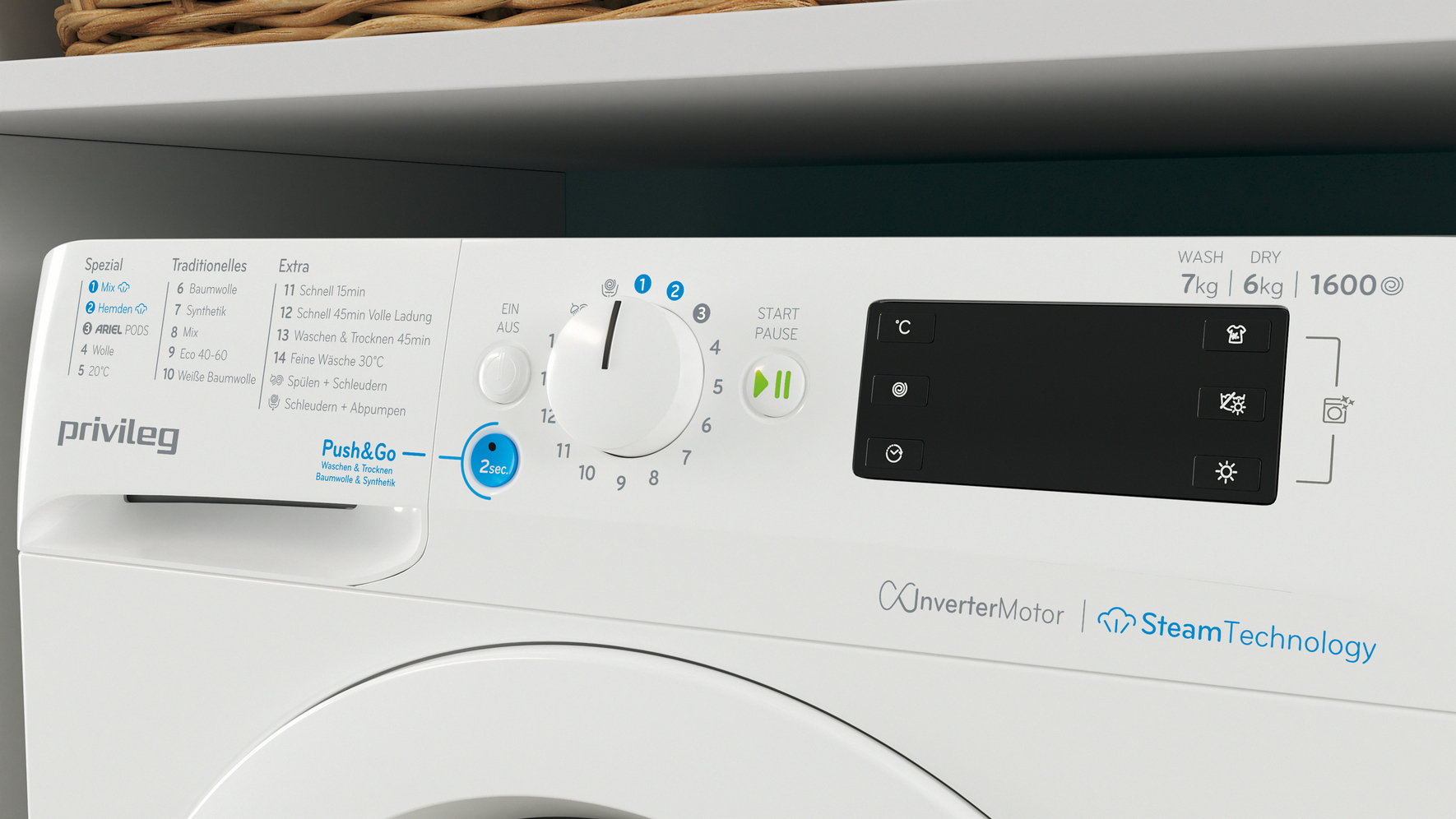 - Push&Go – Nur 1 Taste und 2 Sekunden für das Einschalten, die Programmauswahl und den Start des Wasch- und Trockenprogramms