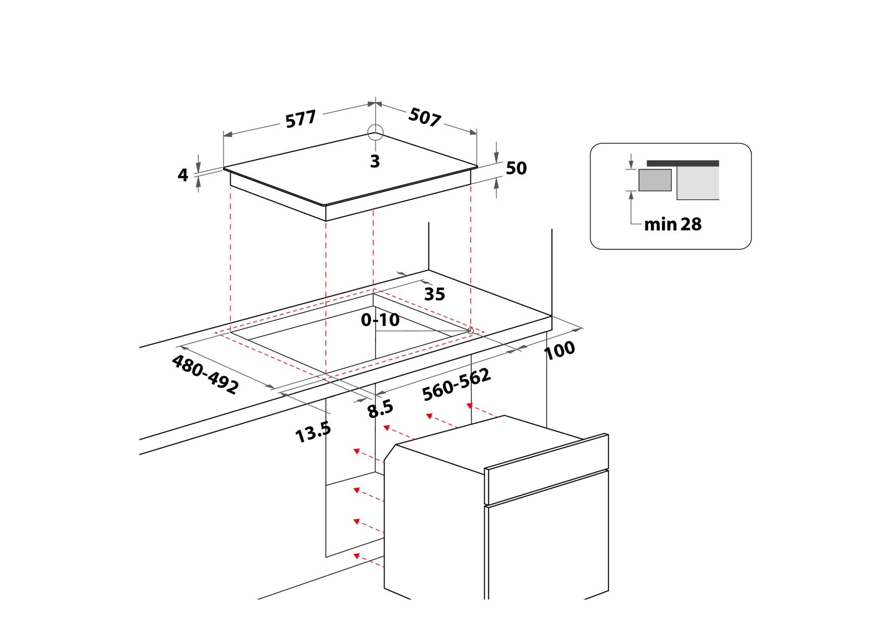 - Ausschnittmaße (BxT): 560x480 mm