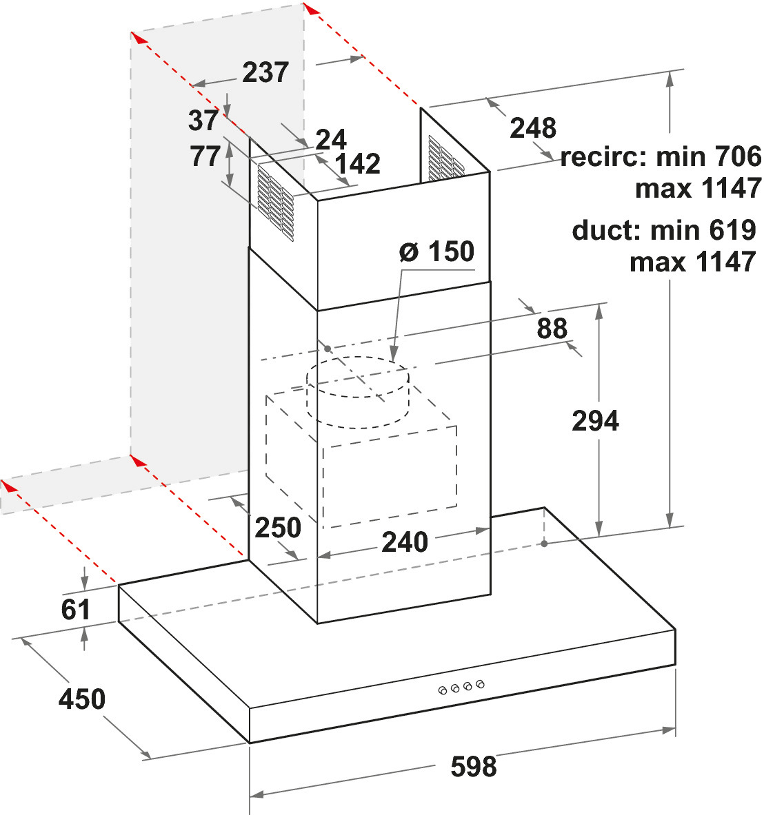 - Mindestabstand zum Gaskochfeld 650 mm