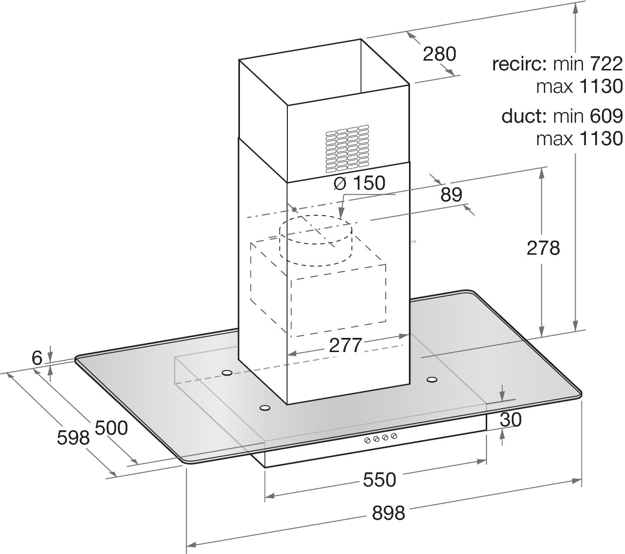 - Mindestabstand zum Elektrokochfeld 500 mm