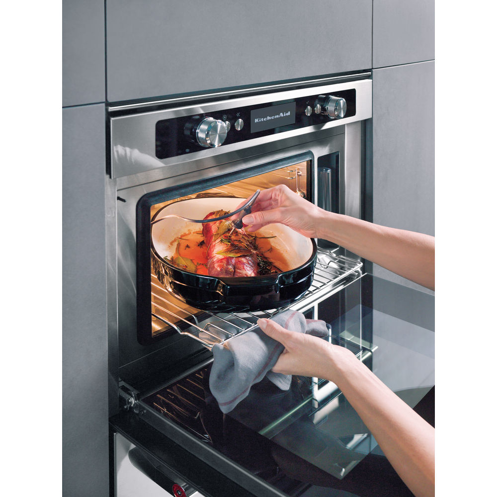 Der Kombi-Dampfgarer der Black Stainless Steel Collection verfügt zudem auch über ein Speisenthermometer. Die Innentemperatur der Speise wird konstant auf dem Digital-Display des Ofens angezeigt Wählen Sie die gewünschte Temperatur, und Ihr KitchenAid Dampfgarer wird diese Temperatur mit der absoluten Präzision beibehalten, die Sie benötigen um eine hervorragende Bressepoularde mit gelbem Wein zu kochen.