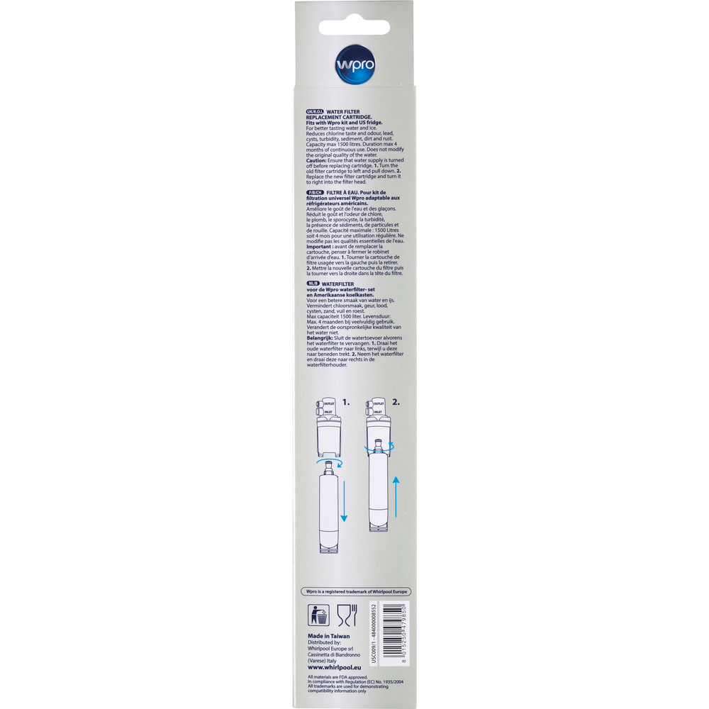 Die Wpro Wasserfilterpatrone für US Kühlschränke beseitigt mittels eines Aktivkohlefilters Chlor und Wasserverunreinigungen, wie Blei, Ablagerungen und Trübungen, die aus dem Leitungsnetz resultieren können. Kapazität 1500 Liter.Zertifiziert nach Reg. EU 1935/2004